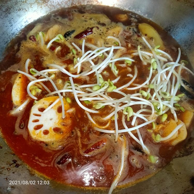 干辣椒花椒 生姜片 大蒜 火锅底料 下锅小火炒一分钟 倒入一瓶啤酒 一碗水 大火煮开